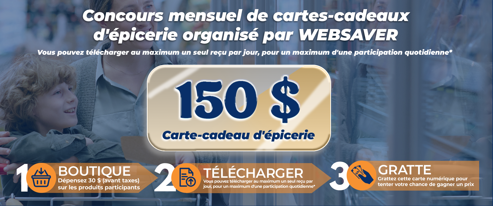*Ouvert aux résidents canadiens ayant atteint l'âge de la majorité dans leur province ou territoire et disposant d'une adresse e-mail valide. Offre de tirage au sort mensuel de cartes-cadeaux d'épicerie webSaver du 23 avril 2026 au 31 mai 2026. Justificatif d'achat requis. Les reçus doivent être envoyés avant le 31 mai 2026. Reçus personnels uniquement. Téléchargez au maximum un reçu par jour pour obtenir une participation au tirage mensuel d'une carte-cadeau d'épicerie d'une valeur de 150 $. Après le téléchargement, grattez une carte à gratter sur la page de remerciement pour tenter de gagner 1 $ de remise en argent versé directement dans votre portefeuille webSaver. Dans la limite des stocks disponibles. Les conditions générales de la carte s'appliquent. Consultez les conditions générales pour connaître les produits participants et les conditions générales complètes. Offre nulle à l'extérieur du Canada et là où elle est interdite, taxée ou restreinte. Tous droits réservés. © 2026. Commanditaire : webSaver.